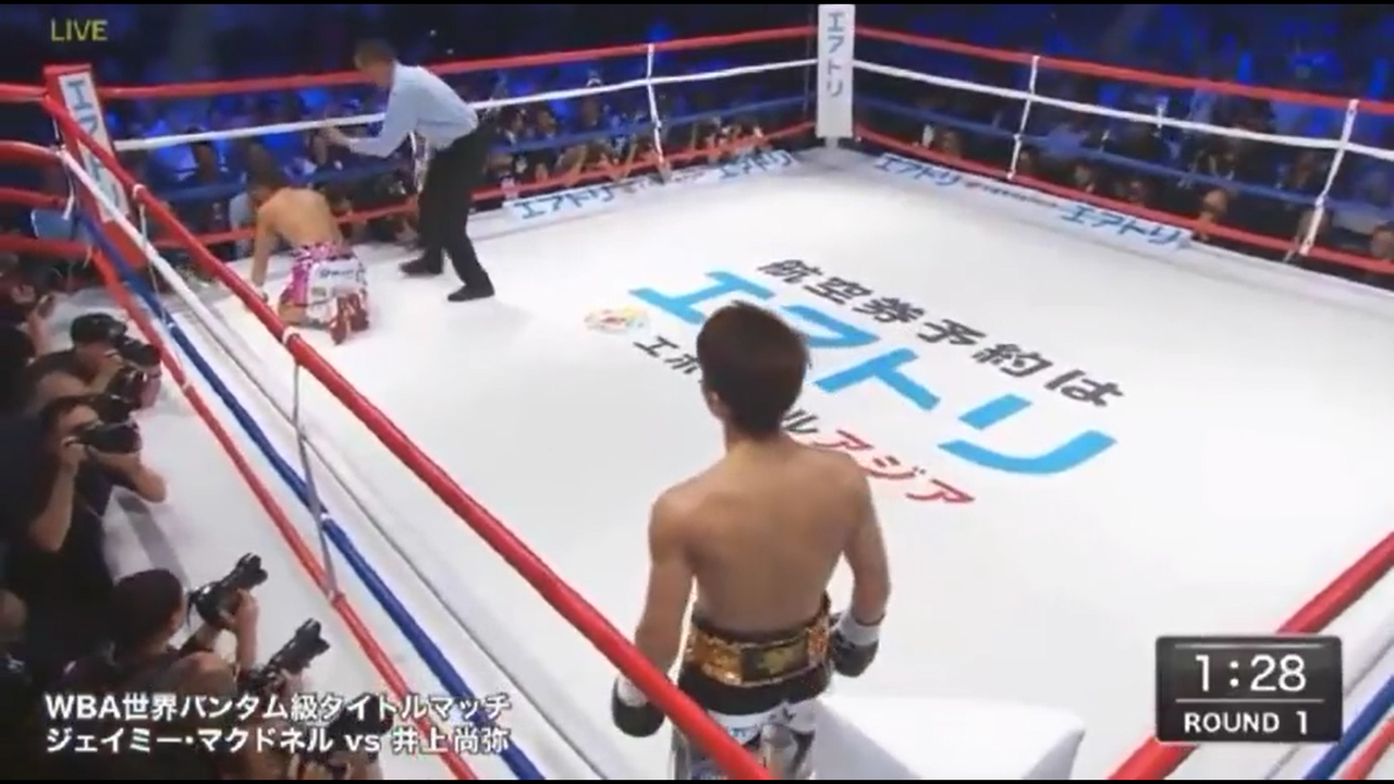 井上尚は初回に左ボディーでダウンを奪い、一気の連打を繰り出すとレフェリーが試合を止めた。前日計量など3日連続で