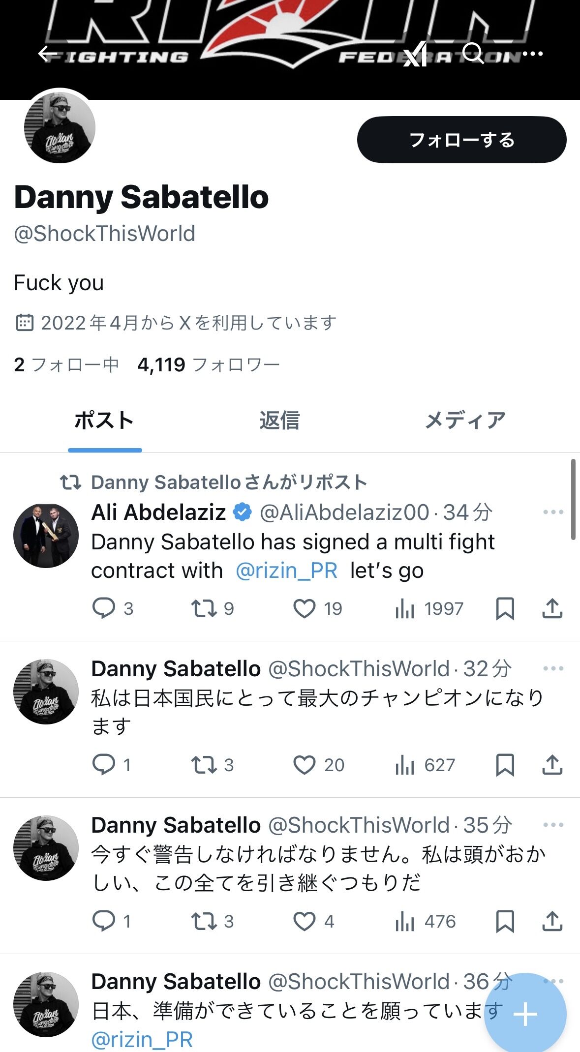 ダニー・サバテロはインスタでRIZINと契約した事を発表しました📝